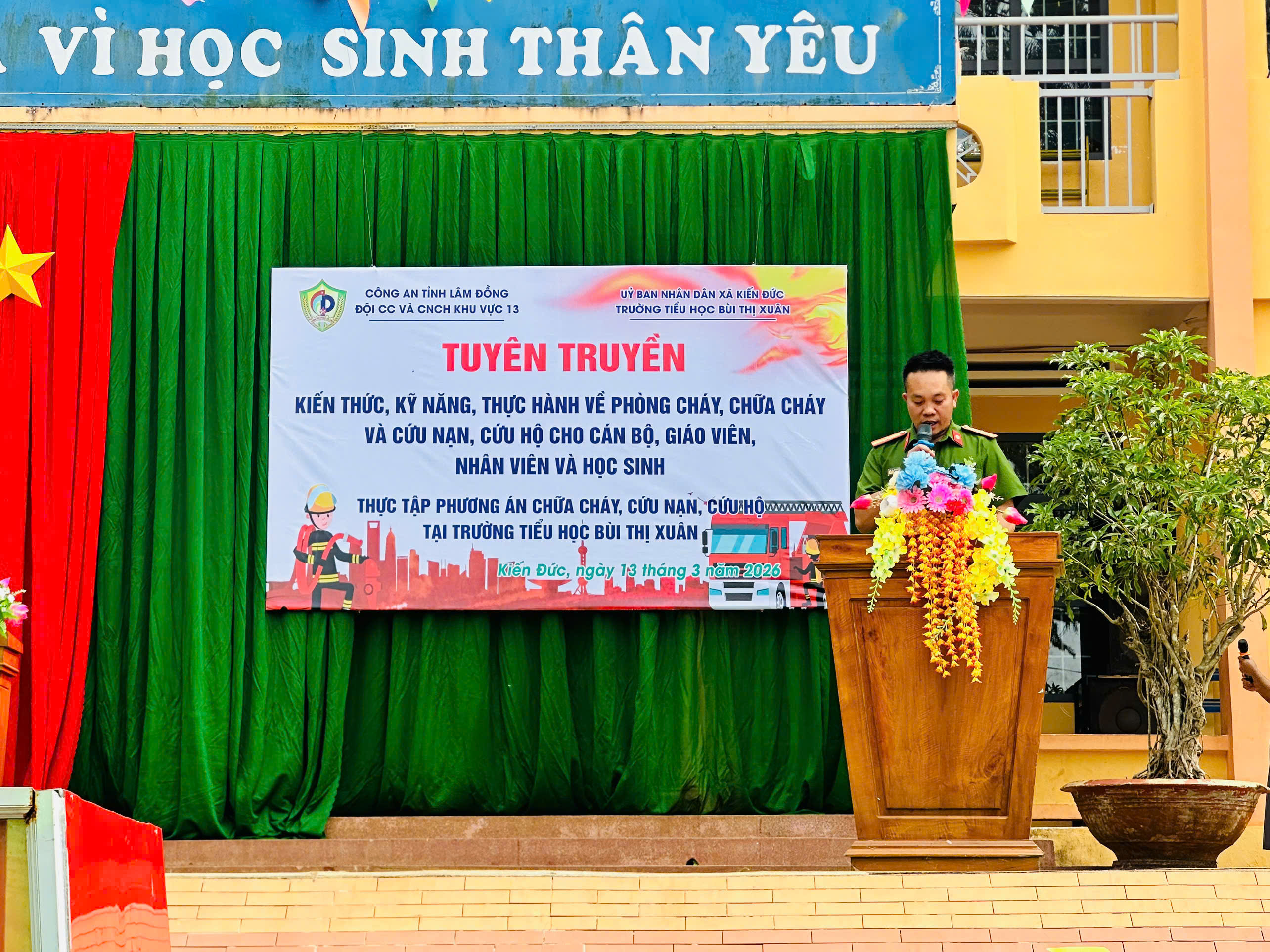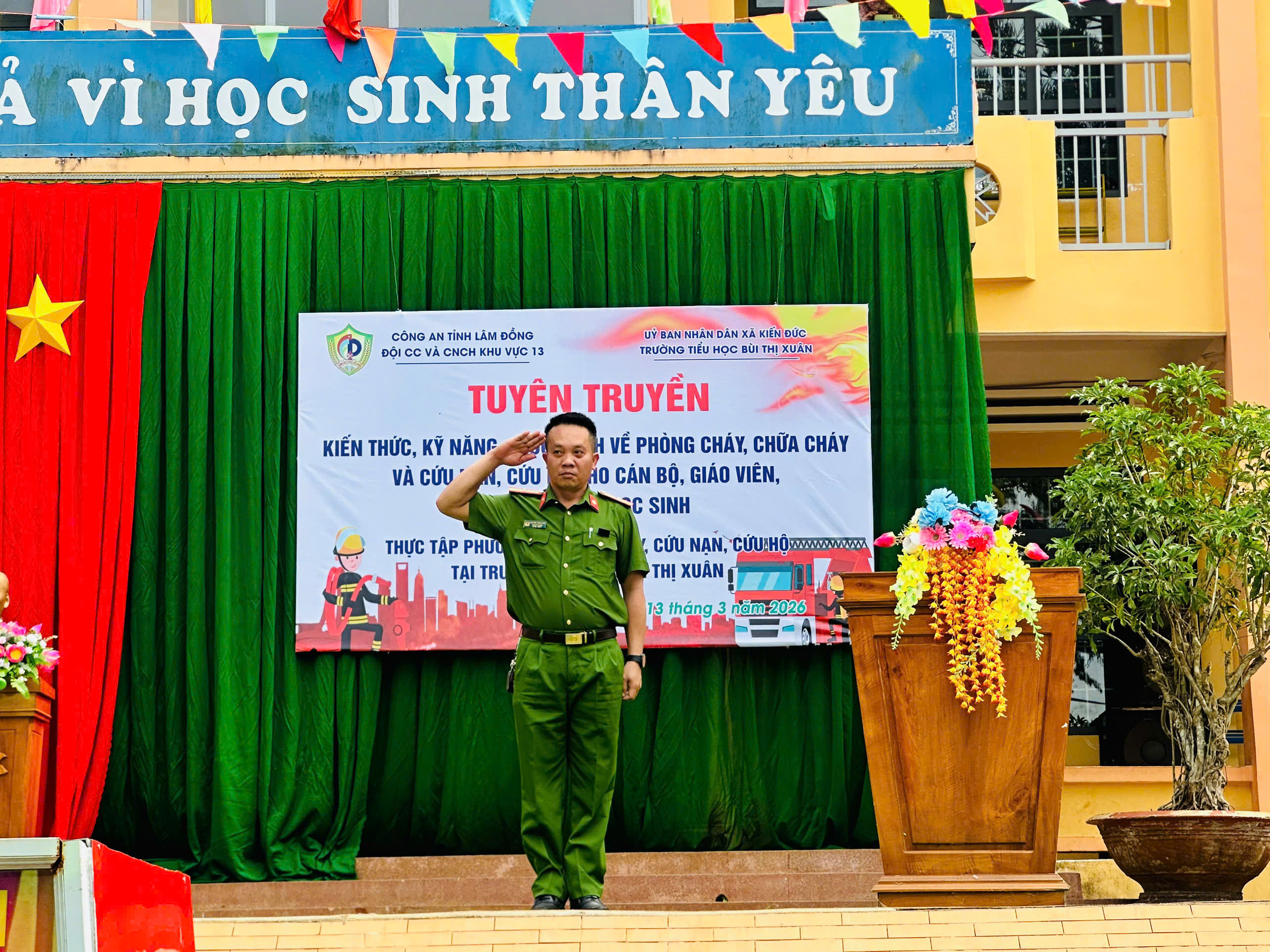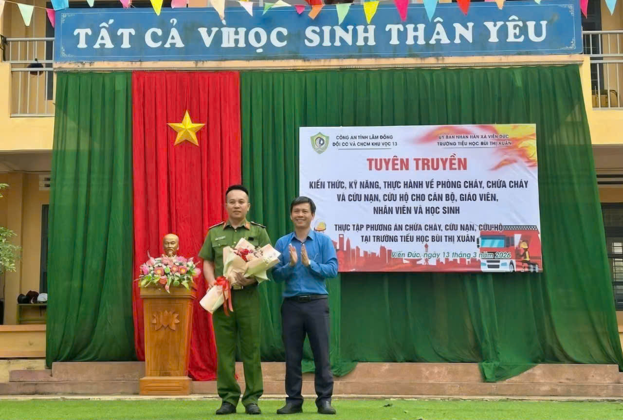 Chiều ngày 13/3/2026, Trường Tiểu học Bùi Thị Xuân (Thôn 2, xã Kiến Đức, tỉnh Lâm Đồng) đã phối hợp cùng Đội Cảnh sát PCCC và CNCH khu vực 13 – Công an tỉnh Lâm Đồng tổ chức thành công buổi tuyên truyền, phổ biến kiến thức và diễn tập phương án chữa cháy, cứu nạn cứu hộ (PCCC & CNCH).
